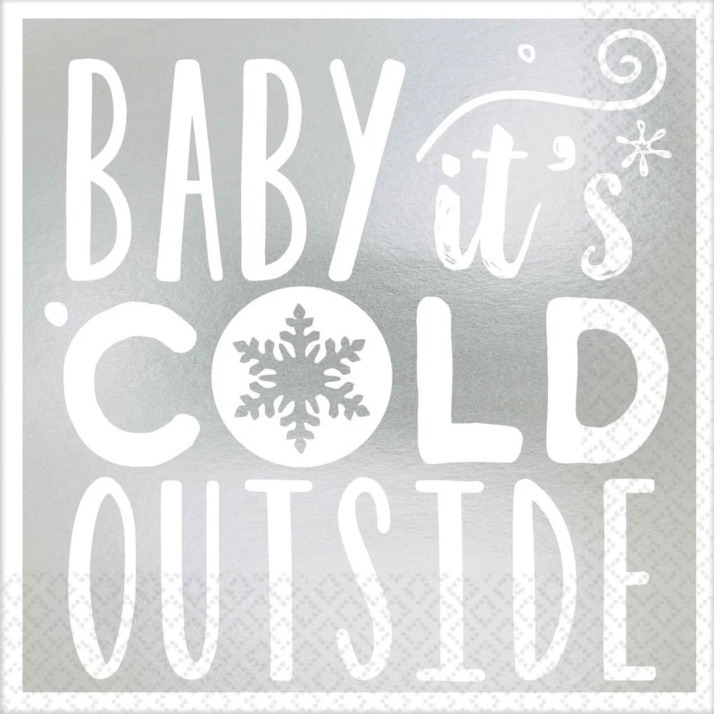 - Set of 16 silver coloured paper napkins with the words ‘Baby It’s Cold Outside’ foil hot stamped
