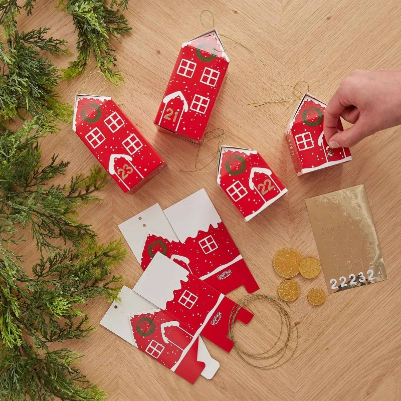 Deck The Halls Advent Calendar DIY – Each pack contains: 12 Boxes 13cm H, 12 Boxes 9cm H, 24 number stickers, gold twine.