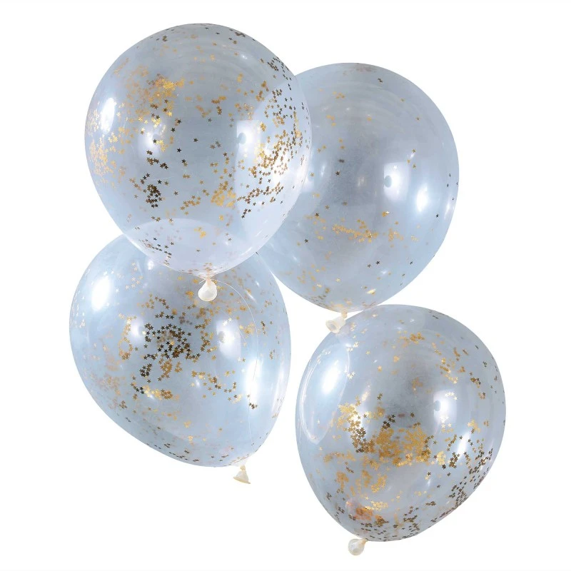 - Pack of 5 transparent balloons with gold glitter confetti inside