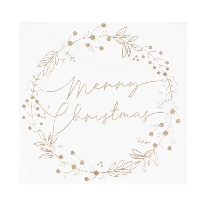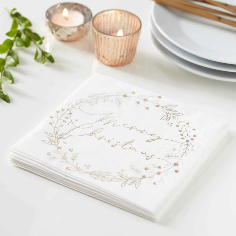 - Set of 16 white paper napkins with gold colour patterns and the message ‘Merry Christmas’