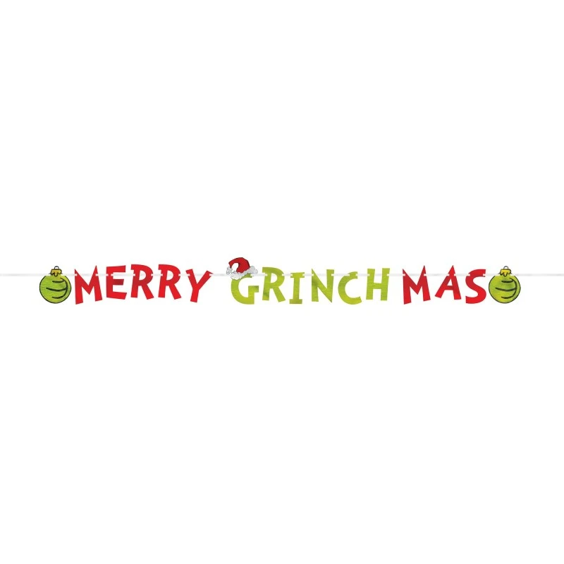 - Foil letter banner in red and green colour spelling out ‘Merry Grinchmas’ and with ornament design on either end