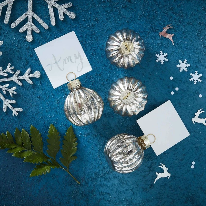 Silver Christmas Bauble Place Card Holders – Each pack contains: 6 x Card Holders 4cm (D).